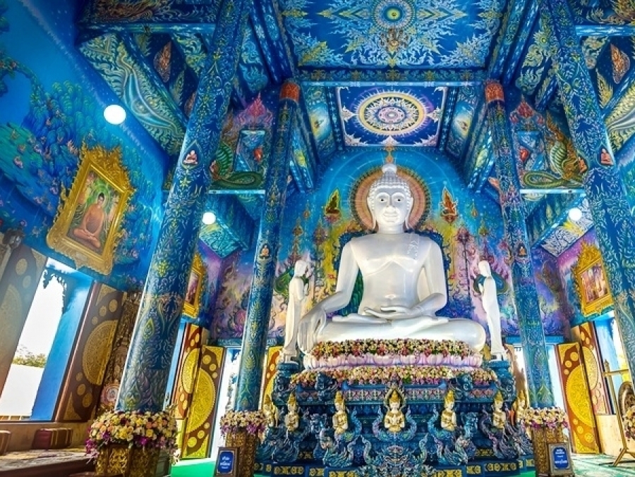 This temple is a unique applied art which use shades of blue. The work is created by Chiang Rai local artists with high skill who was a pupil of Chalermchai Kositpipat (National Thai Artist)